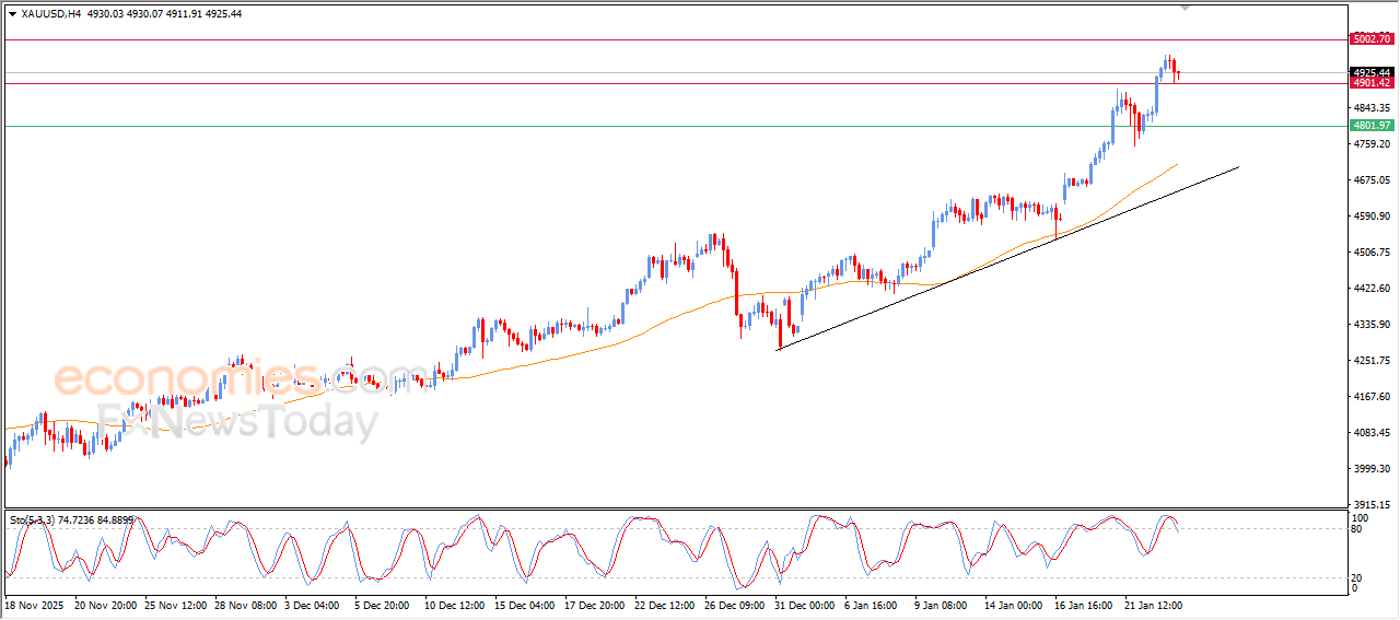 Die prys van goud het in sy laaste intradag-verhandeling gedaal en die drumpel van historiese weerstand teen $5 000 genader. Dit het 'n natuurlike winsnemingsgolf gesien na sy opeenvolgende winste voorheen, en probeer om sommige van sy duidelike oorgekoopte toestande op relatiewe sterkte-aanwysers af te laai, veral met die opkoms van die negatiewe seine daarvandaan, wat sy bullish momentum versamel wat dit kan help om sy winste te hervat en nuwe rekordhoogtepunte te behaal, te midde van die oorheersing van die hoof bullish tendens op korttermynbasis.