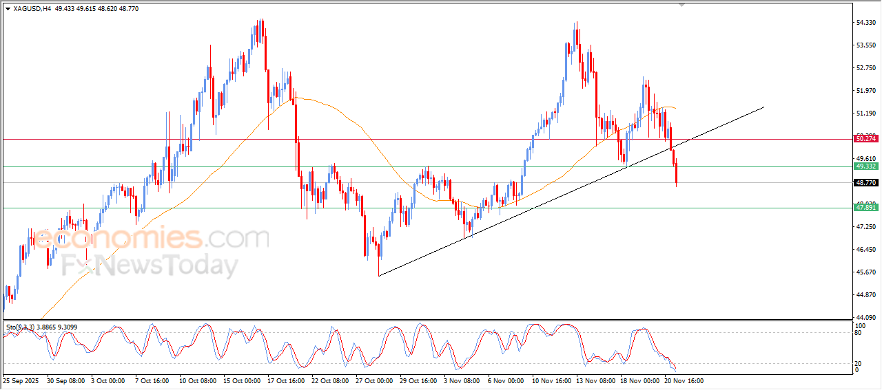Die prys van (silwer) het sy verliese in sy laaste intradag-verhandeling verdiep, te midde van die voortsetting van die negatiewe druk wat voortspruit uit sy verhandeling onder EMA50, wat die bullish tendenslyn op die korttermynbasis verbreek en die negatiewe druk versterk, veral met die opkoms van negatiewe seine op die relatiewe sterkte-aanwysers, ten spyte van die bereiking van oorverkoopte vlakke.