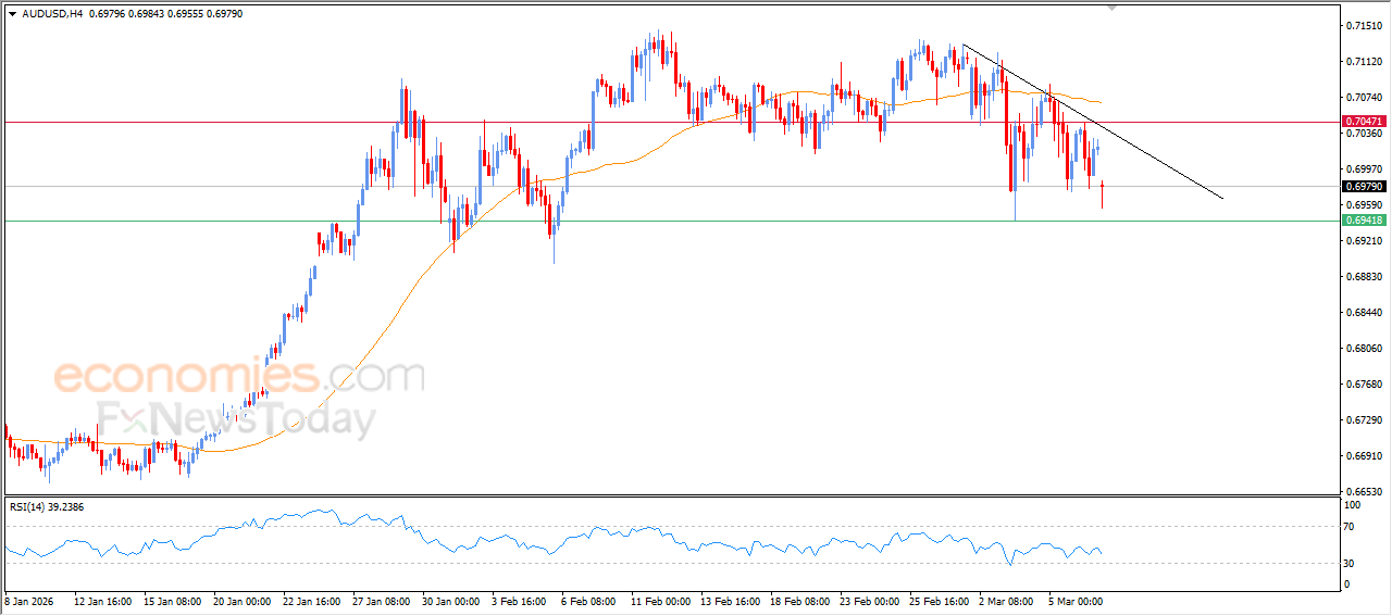 Die (AUDUSD) prys het in sy laaste intradag verhandeling gedaal, te midde van die oorheersing van 'n lomp korrektiewe golf op korttermyn basis, met die verhandeling langs die ondersteunende tendenslyn vir hierdie baan, wat hierdie negatiewe druk versterk as gevolg van die verhandeling onder EMA50, wat die kanse op herstel op kort termyn verminder, veral met die opkoms van negatiewe seine van relatiewe sterkte-aanwysers, nadat die oorverkoopte toestande verlig is, wat die weg baan vir die aanteken van meer verliese in die komende tydperk.