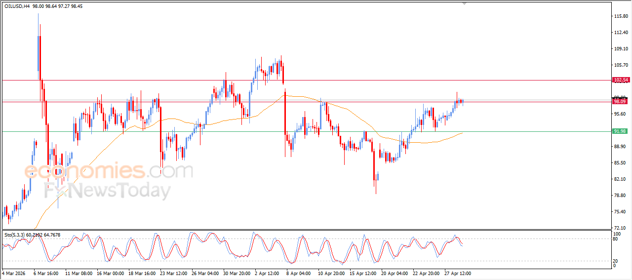 Ru-oliepryse het effens gestyg met versigtige beweging in onlangse intradaghandel, aangesien die prys voortgaan met sy pogings om die sleutelweerstandsvlak by $98.00 te breek, wat 'n poging aandui om die huidige bullish golf te verleng.