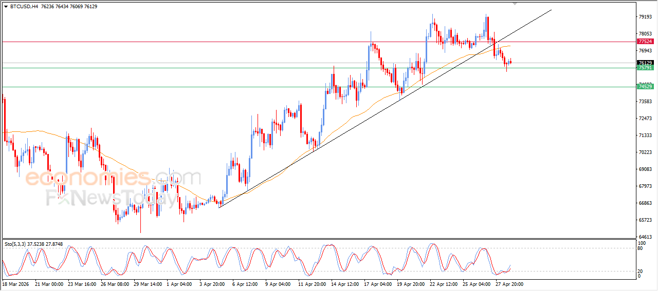 Bitcoin (BTCUSD) het gedaal tydens sy onlangse intradag-verhandeling en het 'n potensiële deurbraak van die huidige ondersteuningsvlak van $75 500 genader. Dit dui op toenemende verkoopdruk en voortgesette korttermyn-swakheid, veral nadat die prys voorheen beïnvloed is deur 'n groot bullish tendenslyn te breek.